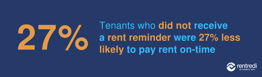 After accounting for other behaviors such as prior lateness, autopay enrollment, and rent amounts, RentRedi data found that tenants who did not receive rent reminders were 27% less likely to pay within their rent payment grace period. RentRedi’s study focused on tenants who had already missed their initial due date, since most rent reminders are sent either on the due date or after the due date.
