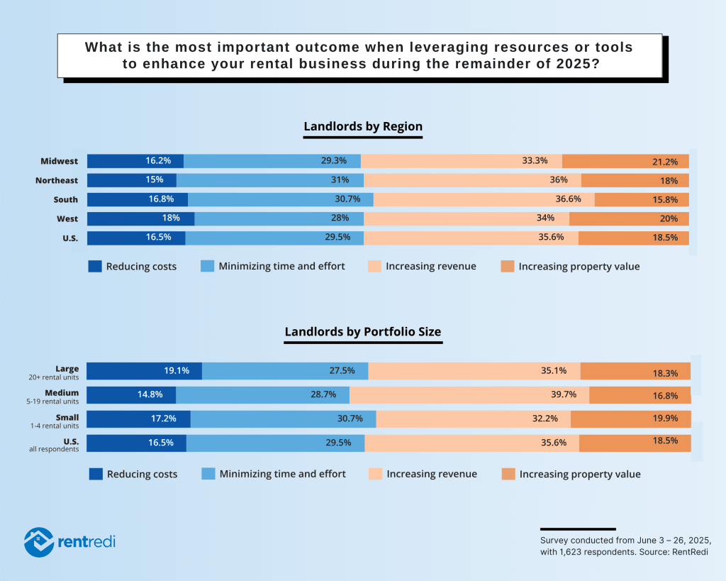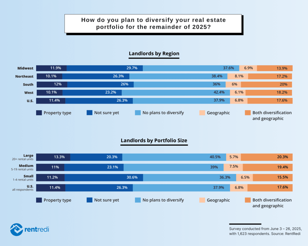 RentRedi landlords were surveyed between June 3-26, 2025. There were 1,623 respondents in total. Landlords were classified into U.S. regions by their primary business location as follows: Northeast (CT, MA, ME, NH, NJ, NY, PA, RI); Midwest (IA, IL, IN, KS, MI, MN, MO, ND, NE, OH, SD, WI, VT); South (AL, AR, DC, DE, FL, GA, KY, LA, MD, MS, NC, OK, SC, TN, TX, VA, WV); and West (AK, AZ, CA, CO, HI, ID, MT, NM, NV, OR, UT, WA, WY). Landlords were also classified by real estate portfolio size as follows: small landlords (1-4 rental units); medium landlords (5-19 rental units); and large landlords (20+ rental units). Percentages have been rounded to the nearest whole number, and therefore the values in each barchart may not equal 100%. Separately, BiggerPockets conducted its own surveys via YouTube in June and July 2025.