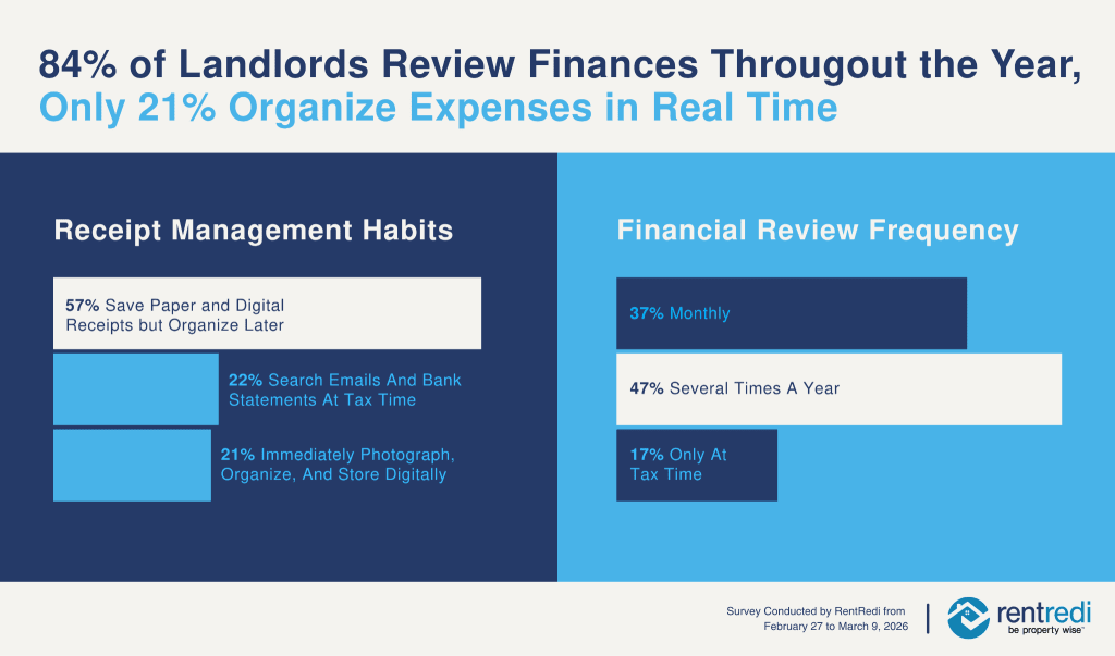 These findings come from the 2026 Rental Accounting and Tax Preparation Survey, released today by RentRedi, the fastest-growing property management software built for smart real estate investors. The survey highlights a clear pattern: while most landlords are actively engaged with their finances throughout the year, many are still relying on manual accounting systems that lead to procrastination and a last minute tax preparation sprint that is time-intensive and stressful.