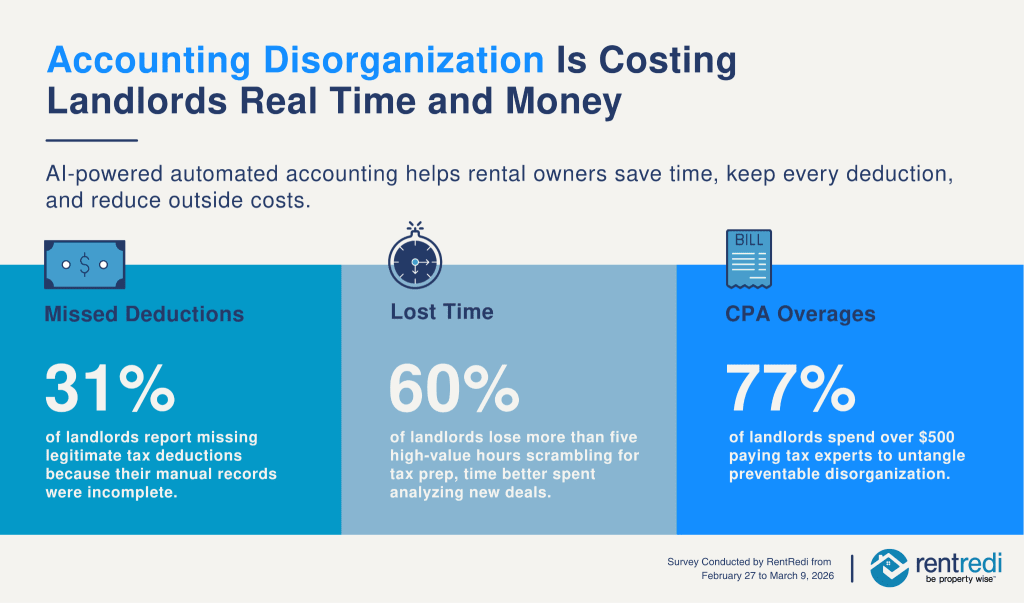 NEW YORK, NY,  March 31, 2026 — AI can solve 78% of tax preparation headaches for rental owners, according to a new RentRedi survey in which 59% of landlords say expense categorization is their biggest tax prep challenge and 19% report struggling most with finding receipts. What has long been seen as a time-consuming, manual process is now emerging as one of the most solvable problems in rental property accounting.