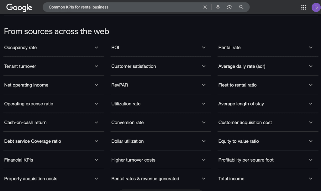 However, there is more to financial management than meets the eye. Google search lists most of the KPIs used in real estate (see below); However, we’ll tackle some of the most important key metrics for your rental business. That said, here’s what to track and measure: