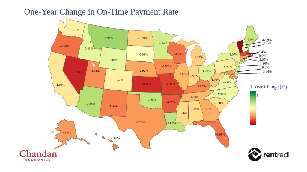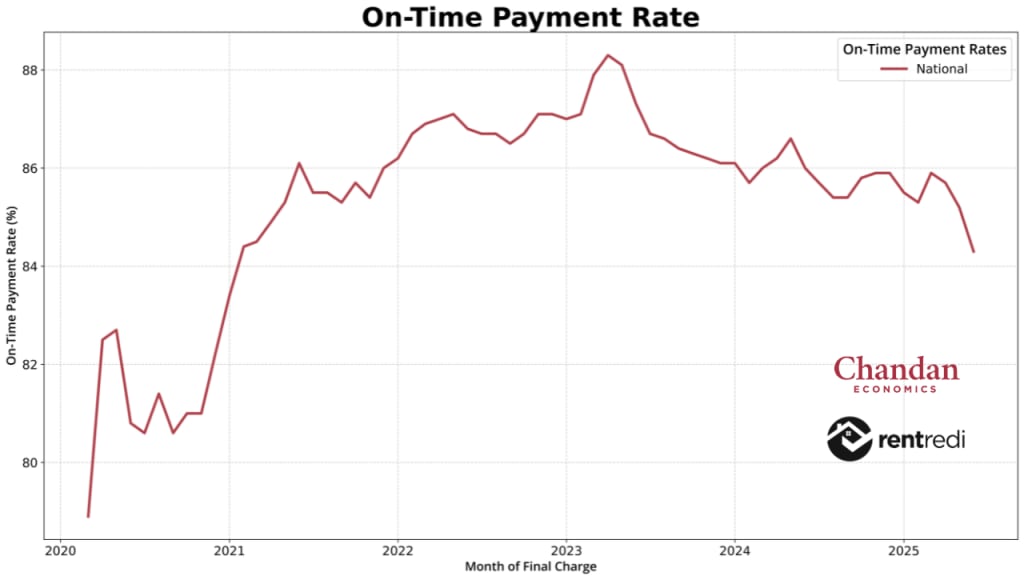 Compared to June 2024, the national on-time payment rate is down 108 basis points, the steepest year-over-year decline since last August. This makes 23 consecutive months of year-over-year weakening.