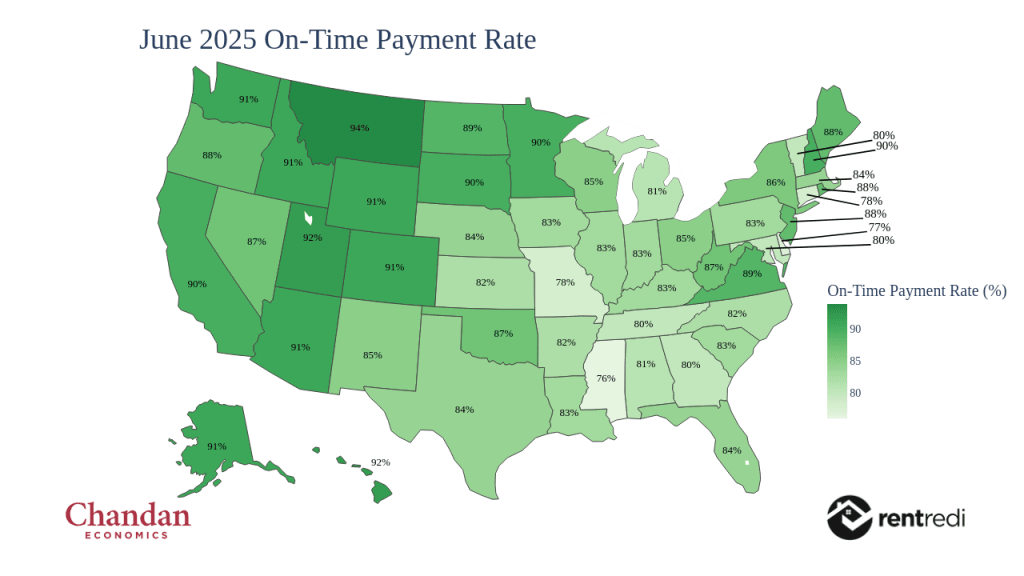 On-time payment performance can vary substantially from state-to-state and region-to-region as shown in Figure 2. The highest-performing state in June 2025 was Montana (94%), and the lowest was Mississippi (74%).