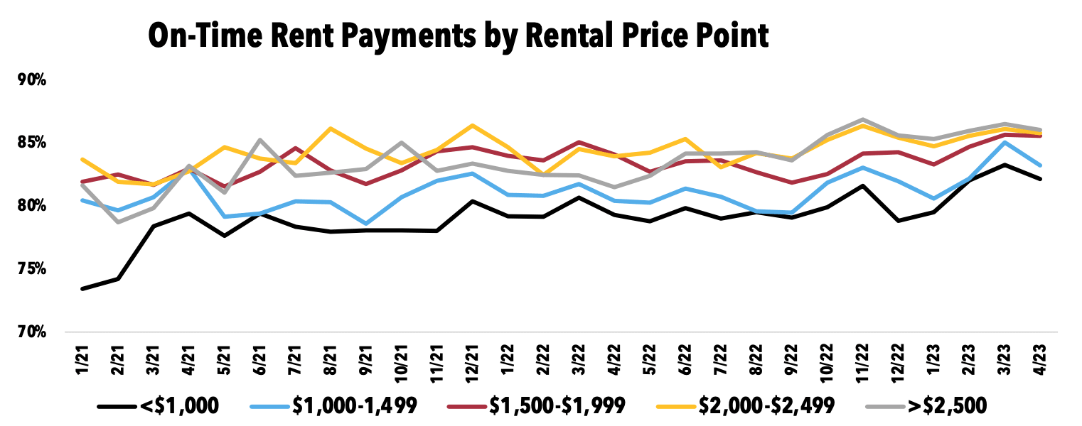 - On-time payment rates dropped across all price points in April, with low-priced rentals seeing the largest month-over-month declines.