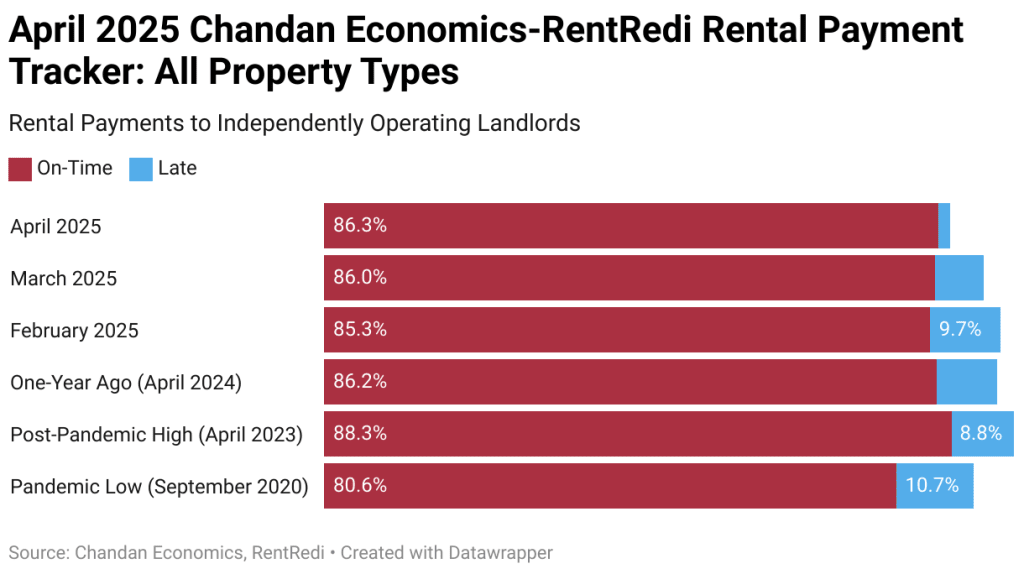 - In April 2025, the on-time payment rate in independently operated rental units jumped by 45 basis points (bps), rising to 86.3%.