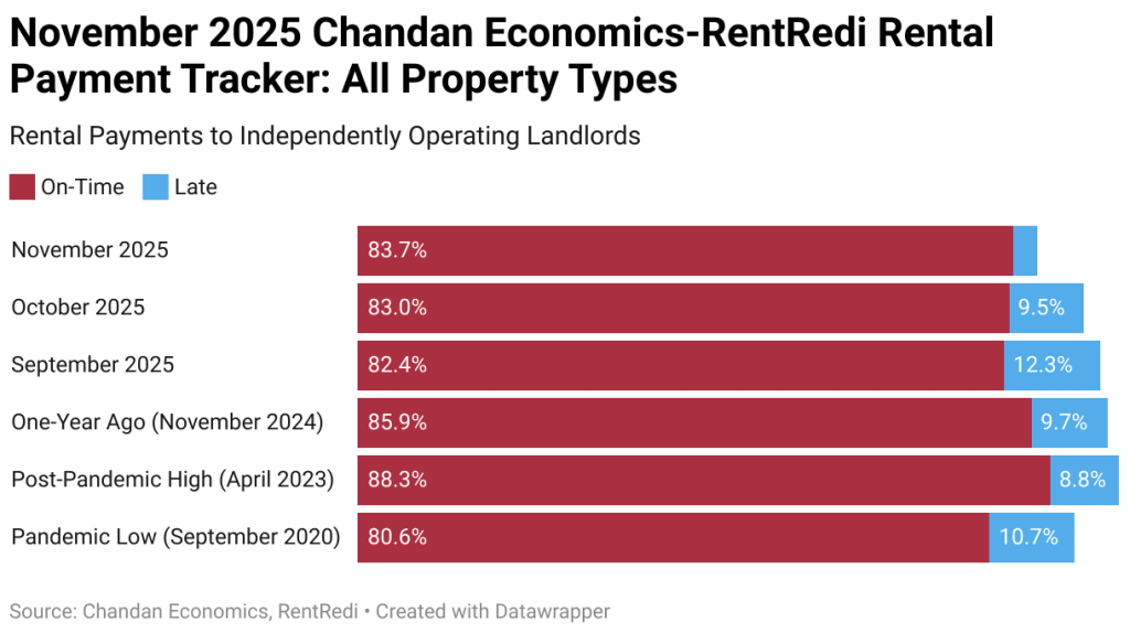 Wondering how on-time rent payments are faring across the nation? Take a look at Chandan Economics & RentRedi’s Independent Landlord Rental Performance Report for November 2025.