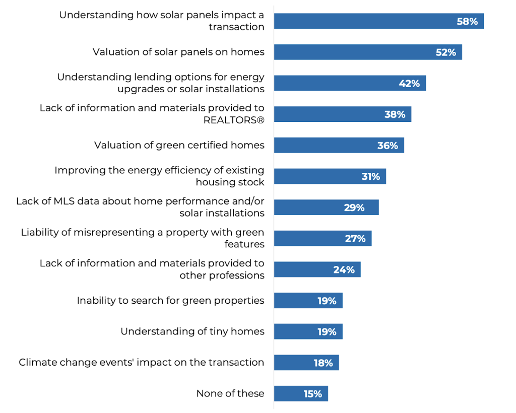 The biggest challenges around sustainability are understanding how solar panels affect a sale (58%) and how they’re valued in a home (52%). Another 42% said figuring out lending options for energy upgrades or solar installations was also a key concern.