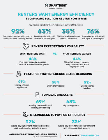 A recent SmartRent survey of U.S. renters found that 92% care about cutting monthly utility costs when choosing a home. Nearly two-thirds (63%) saw their utility bills rise last year, with 35% facing hikes of over $51 a month.