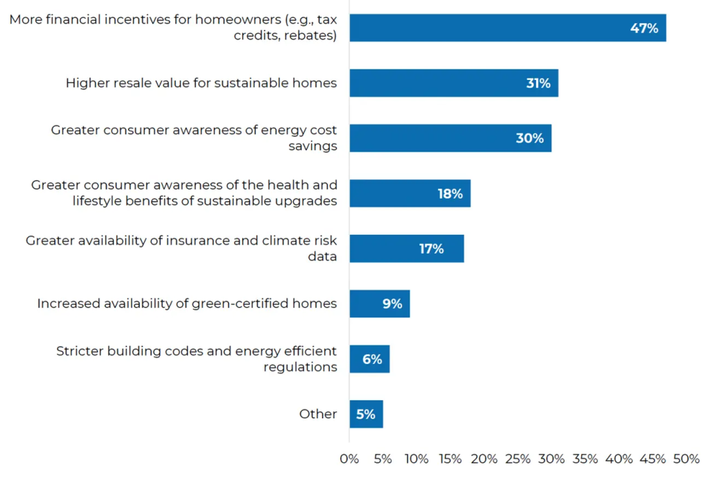 - Tax incentives: Property owners who invest in energy efficiency can receive these incentives. AND here’s good news: Nearly half of respondents (47%) said tax credits or rebates would make them more interested in sustainable homes.