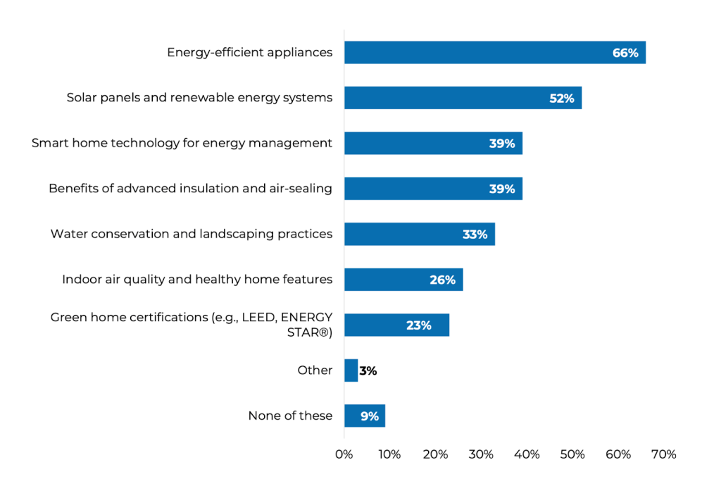 When it comes to home sustainability, most realtors are most knowledgeable about energy-efficient appliances (66%) and solar or renewable energy systems (52%). About two in five were also familiar with smart home tech for energy management (39%) and the benefits of better insulation and air sealing (39%).