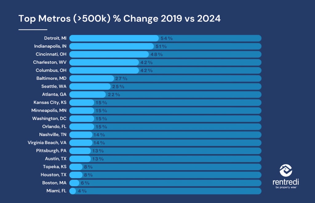 - Detroit-Warren-Dearborn, MI (+54.3%), Indianapolis, IN (+50.8%), and Cincinnati, OH-KY-IN (+48.2%) lead the growth in percentage terms.