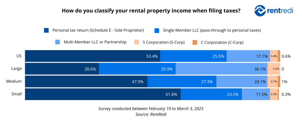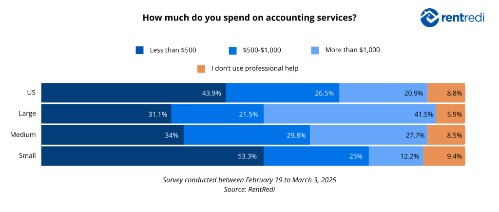 RentRedi landlords were surveyed between February 19 – March 3, 2025. There were 1,891 respondents in total. Landlords were classified by real estate portfolio size as follows: small landlords (1-4 rental units); medium landlords (5-19 rental units); and large landlords (20+ rental units). Percentages have been rounded to the nearest whole number, and therefore the values in each bar chart may not equal 100%.